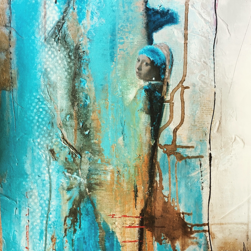 Een gelaagd, abstract werk met mixed media.