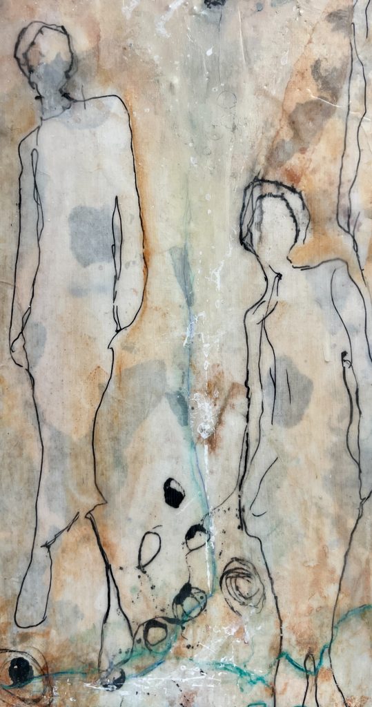 Het gebruik van was geeft een extra dimensie aan mijn werk. De was verzacht, geeft een subtiele glans en maakt het werk nog gelaagder en soms een beetje mystiek. Met mixed media en verschillende technieken werk ik figuratief of abstract.